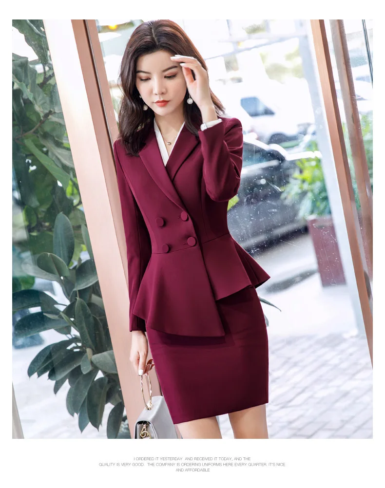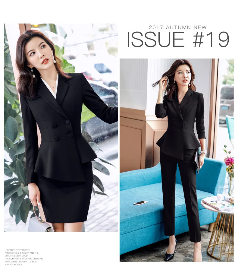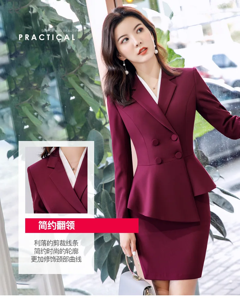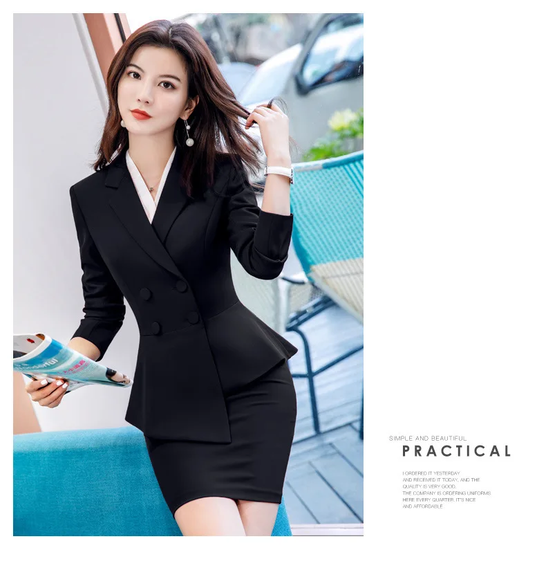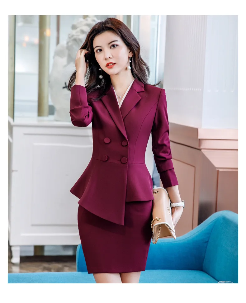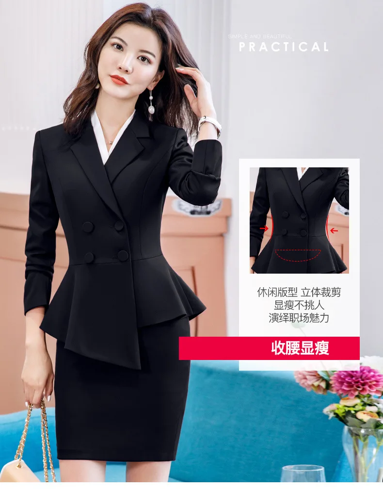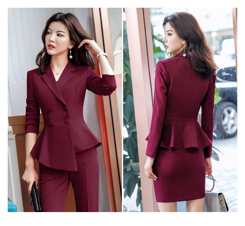 This pant suit, with its double-breasted blazer and pencil pants, is perfect for autumn/winter office environments.
